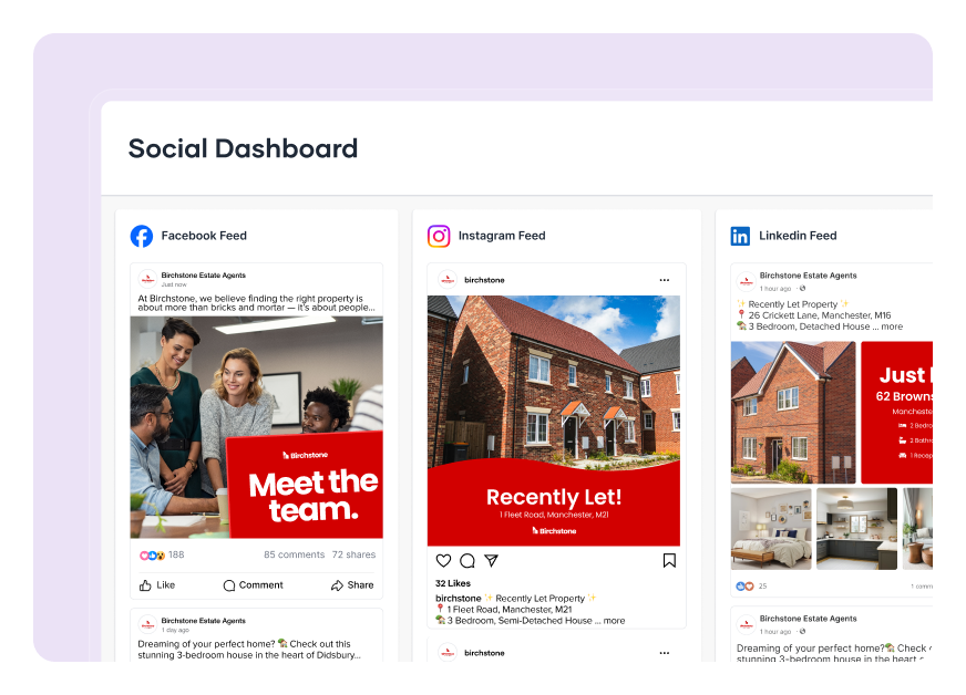 Effortlessly sync your social feed by linking out to your properties, valuation tools, website and more.